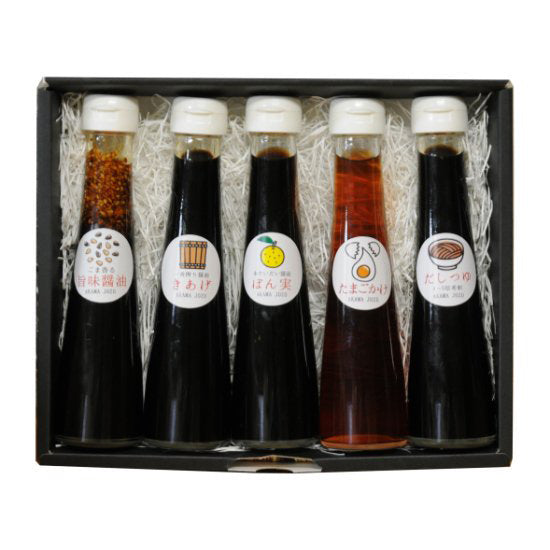 赤間醸造で特に人気の商品を5本揃えました。食卓でも楽しんでいただけるようビンとラベルにもこだわりました。おいしく楽しくおしゃれと評判のギフトです。
