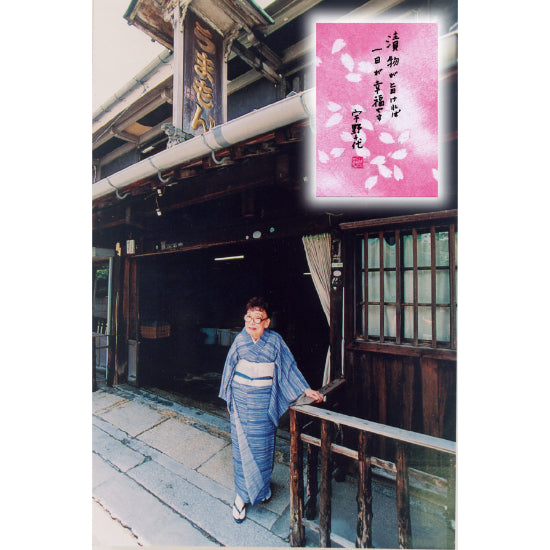 社屋内七つの井戸から湧き出る清冽な錦川の伏流水で、 原菜を洗い漬け込んでいきますので酵母や乳酸菌の力を弱めることはありません。 元醤油蔵の酵母を受け継いだ発酵漬物の逸品をご賞味ください。 故郷岩国の文化と風土と人々をこよなく愛された 作家・宇野千代さんは1日の始まりに毎朝欠かさず 食べていたものは生家の庭で取れた梅干しと 伝統を守り続けた手間のかかった漬物「うまもん」でした。 うまもん本社を訪れになった宇野千代さんは 「漬物が旨ければ、一日が幸せです 宇野千代」という 直筆の色紙とサインを残されました。