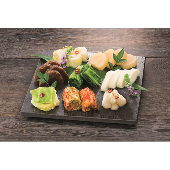 〈内容量・規格〉広島菜本造り180g・三度漬け白菜本造り180g・四度漬けキムチ本造り180g・グリーンボール本漬180g・らっきょう100g・甘酢白たくあん200g・蔵出し田舎たくあん100g・奈良漬五橋120g